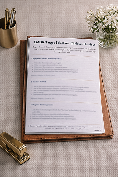 This clinician-focused handout offers a structured way to conceptualize EMDR targets and organize treatment priorities. It includes prompts for identifying symptom-driven target clusters, assessing readiness for reprocessing, and sequencing themes based on client stability and therapeutic goals. Adapted from evidence-based EMDR literature and consultation practices, this tool helps clinicians translate complex case presentations into clear, phase-appropriate EMDR treatment plans. It can be used in individual sessions, supervision, or training contexts to support consistent and ethical application of EMDR principles. For professional use only. This tool is not a substitute for supervision or consultation.