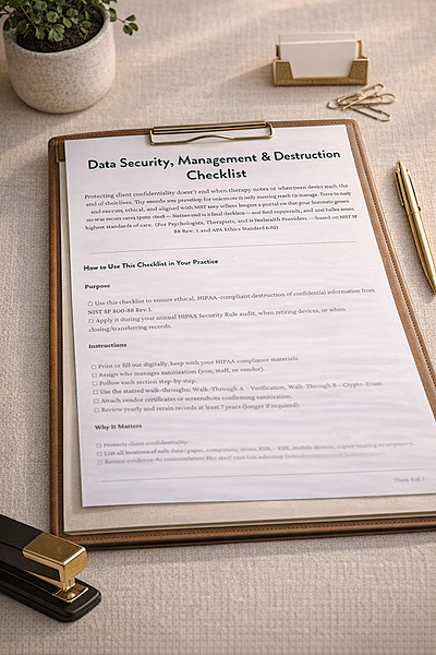 This step-by-step checklist helps clinicians safeguard confidential data from intake to disposal. It clarifies encryption standards, retention timelines, and destruction methods, helping you document compliance and meet the highest ethical standards for data security. It’s structured around NIST SP 800-88 Rev. 1 and HIPAA’s Security Rule, ensuring your workflow meets federal best practices. The guide also includes sample verification logs and vendor documentation examples to streamline compliance. Whether you’re updating old systems or conducting an annual audit, this resource helps you demonstrate due diligence and protect client trust. This checklist is an educational resource intended for licensed mental health professionals. It does not constitute legal advice, risk management consultation, or CE credit. Clinicians are responsible for verifying state and federal requirements applicable to their practice setting.