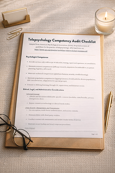 The Telepsychology Competency Audit Checklist helps clinicians evaluate their ethical, legal, and technical competence in providing telehealth services. Adapted from APA’s 2024 Telepsychology Guidelines, it outlines key practice areas including informed consent, data security, and supervision. Clinicians can use it to document compliance and identify areas for continued professional growth. This tool complements the Telehealth: Efficacy, Laws & Ethics CE Course offered by an APA-Approved Sponsor. Disclaimer: This checklist is for educational purposes only and does not constitute legal or clinical advice; users are responsible for ensuring compliance with applicable laws and regulations.