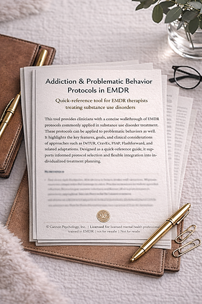This clinician guide summarizes evidence-based EMDR protocols for treating addiction and problematic behaviors. It highlights how to adapt EMDR for craving reduction, relapse prevention, and underlying trauma resolution. Each section includes concise descriptions and clinical indications for major addiction-related protocols—such as DeTUR, CravEx, Flash Forward, and FSAP—with expanded guidance and adaptations informed by Dr. Cassandra Cannon’s clinical experience integrating these approaches in practice. Informed by research and EMDRIA-approved CE content, this resource supports ethical, phase-appropriate integration of EMDR within addiction treatment and recovery settings. For professional use only. This tool is not a substitute for supervision or consultation.