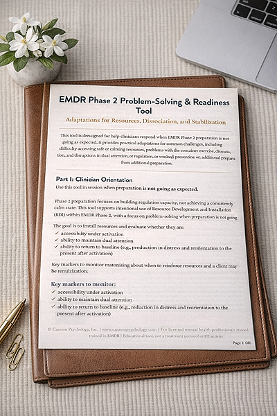 EMDR preparation does not always progress as expected. Clients may have difficulty accessing resources, experience dissociation, or struggle to maintain regulation and dual attention during Phase 2. This tool provides a structured, clinically grounded approach to understanding what is disrupting preparation and how to respond effectively. It guides clinicians through identifying the core issue and selecting targeted adaptations to improve stabilization, strengthen resource access, and support safe progression toward reprocessing. The tool includes practical adaptation options for common challenges, including difficulty accessing safe or calming resources, problems with the container exercise, dissociation, and disruptions in dual attention or regulation. It also supports clinical decision-making around pacing and readiness, helping determine whether additional preparation is needed before moving forward. Designed for use in-session or as part of treatment planning, this resource helps clinicians move from uncertainty to clear, actionable next steps during EMDR Phase 2. How This Differs from the Quick Guide The Quick Guide: EMDR Phase 2 Troubleshooting & Adaptations is a condensed, in-session reference designed for rapid decision-making. This full Problem-Solving Tool provides a more comprehensive, structured process for: evaluating readiness understanding the underlying barrier selecting and organizing targeted interventions Both tools are designed to be used together: the full tool supports deeper clinical decision-making, while the quick guide supports real-time application during sessions. For professional use only. This tool is not a substitute for supervision or consultation.