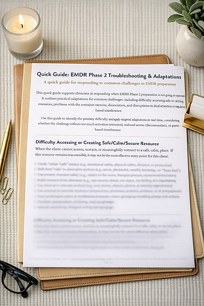 This quick guide is a condensed, in-session version of the EMDR Phase 2 Problem-Solving & Readiness Tool. It is designed for use when preparation is not going as expected and immediate clinical decisions are needed. Rather than working through a full assessment process, this guide provides a streamlined way to identify the core issue and select practical adaptations on the spot. It includes targeted strategies for common Phase 2 challenges, including difficulty accessing safe or calming resources, problems with the container exercise, dissociation or reduced access, and disruptions in dual attention or regulation. Designed as a companion to the full Problem-Solving Tool, this resource allows clinicians to apply stabilization strategies efficiently while maintaining momentum within the session. For professional use only. This tool is not a substitute for supervision or consultation.