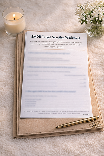 This client-friendly handout helps individuals identify the memories, patterns, and triggers that shape their current struggles. It guides reflection on present symptoms, life themes, and core beliefs, helping clients and therapists work together to select EMDR targets that feel both meaningful and manageable. The format balances structure with openness, allowing clients to share at their own pace while giving therapists a clear foundation for Phase 1 treatment planning. This worksheet can be completed in or between sessions as part of the EMDR preparation process. For professional use only. This tool is not a substitute for supervision or consultation.