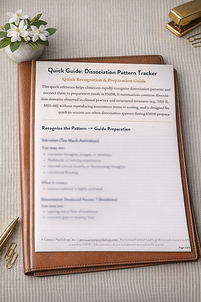 This quick guide is a condensed, in-session version of the Dissociation Pattern Tracker & Clinical Guide. It is designed for use when dissociation appears during preparation or activation and immediate clinical direction is needed. Rather than working through a full tracking and interpretation process, this guide provides a streamlined way to recognize dissociation patterns and link them directly to a preparation focus. It includes common clinical indicators and corresponding stabilization strategies, allowing clinicians to respond efficiently without interrupting the flow of the session. Designed as a companion to the full Pattern Tracker, this resource supports rapid recognition and real-time clinical decision-making during EMDR Phase 2. How This Differs from the Full Pattern Tracker The Dissociation Pattern Tracker & Clinical Guide provides a more detailed framework for observing, differentiating, and interpreting dissociation patterns over time. This Quick Guide is designed for in-session use, offering a simplified structure for rapid recognition and immediate intervention. Both tools are designed to be used together: the full guide supports deeper clinical understanding, while the quick guide supports real-time application. For professional use only. This tool is not a substitute for supervision or consultation.